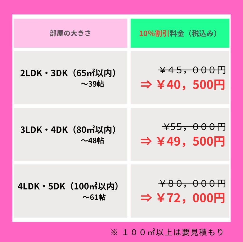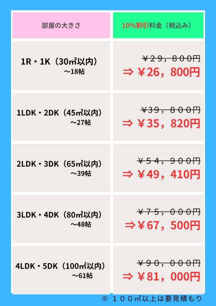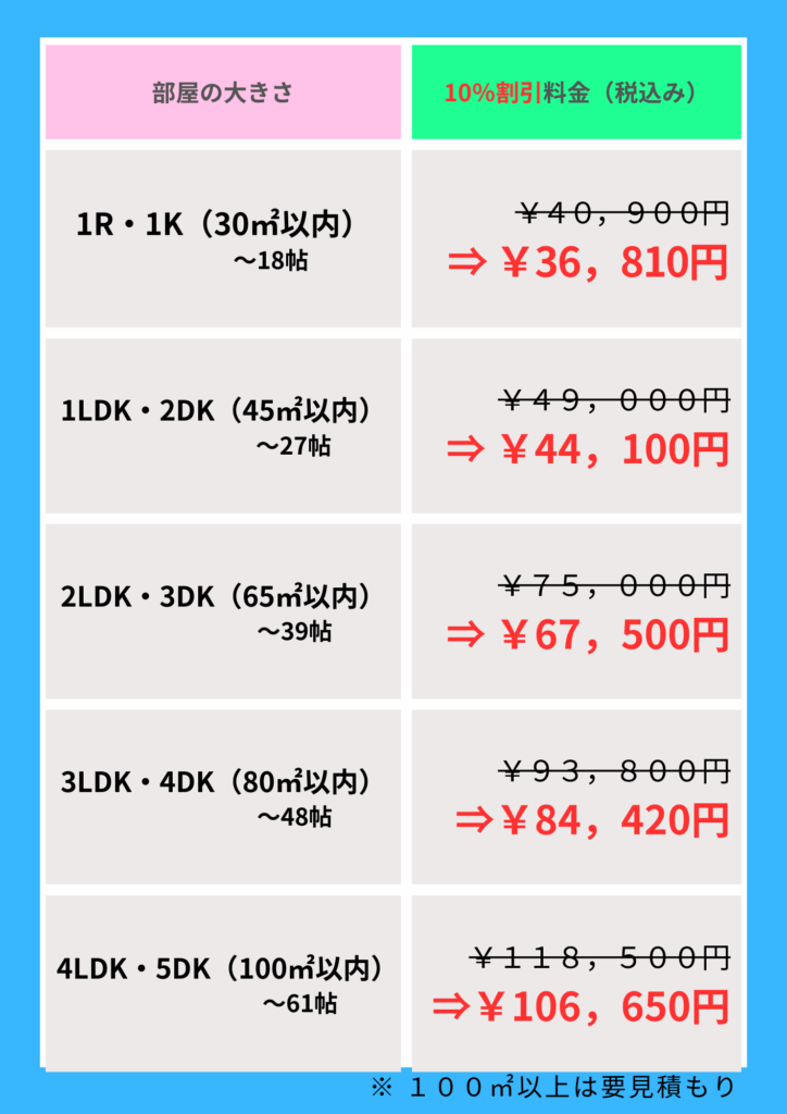 部屋の広さや作業内容によりますが、一般的には1R・1Kで約2〜3時間、3LDKで約5〜6時間程度です。詳細な時間はお見積もり時にご案内いたします。