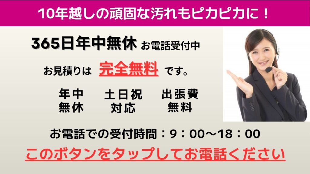 プロ仕様の洗剤で、一般清掃では落ちない頑固な汚れやニオイも徹底除去!除菌・抗菌サービスを標準施工、清潔さが長持ちするのでコスパも抜群。年中無休・土日祝も対応・出張費無料。